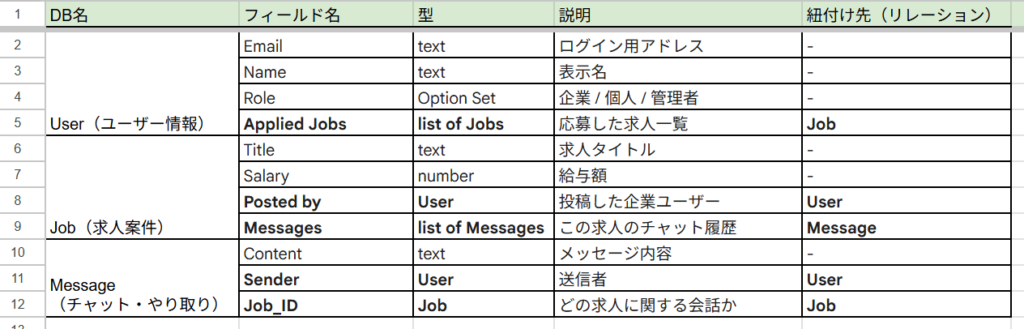 また、ユーザーの種類も「企業側」「個人側」「管理者」など複数存在し、それぞれに異なる画面・機能を用意する必要があるため、開発工数が増加します。データベース設計も複雑になり、パフォーマンス(特にBubble独自のWorkload Unit消費量)を考慮した高度な設計スキルが求められます。